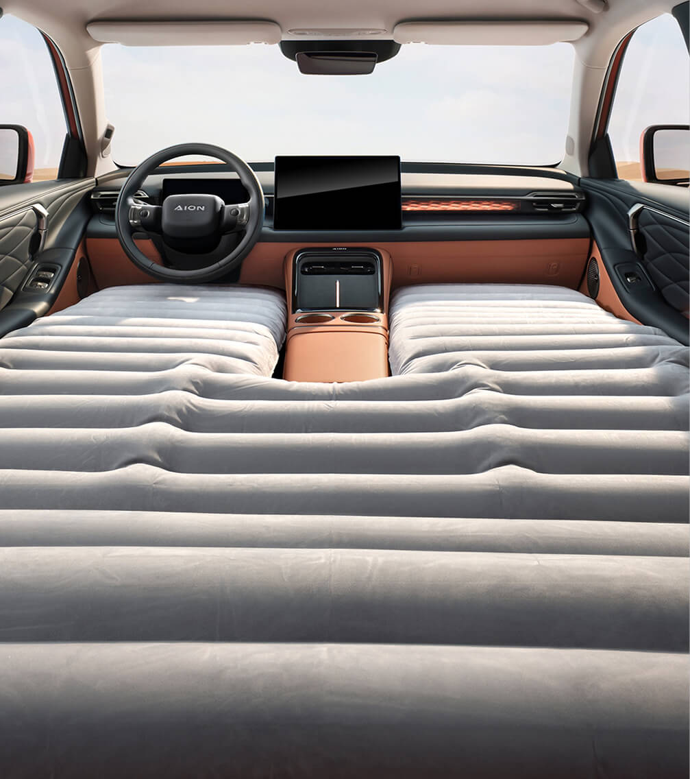 AION V został zaprojektowany z myślą o chwilach poza jazdą. Rozkładane siedzenia i przemyślany układ wnętrza pozwalają zamienić samochód w wygodną strefę relaksu podczas przerwy w trasie.