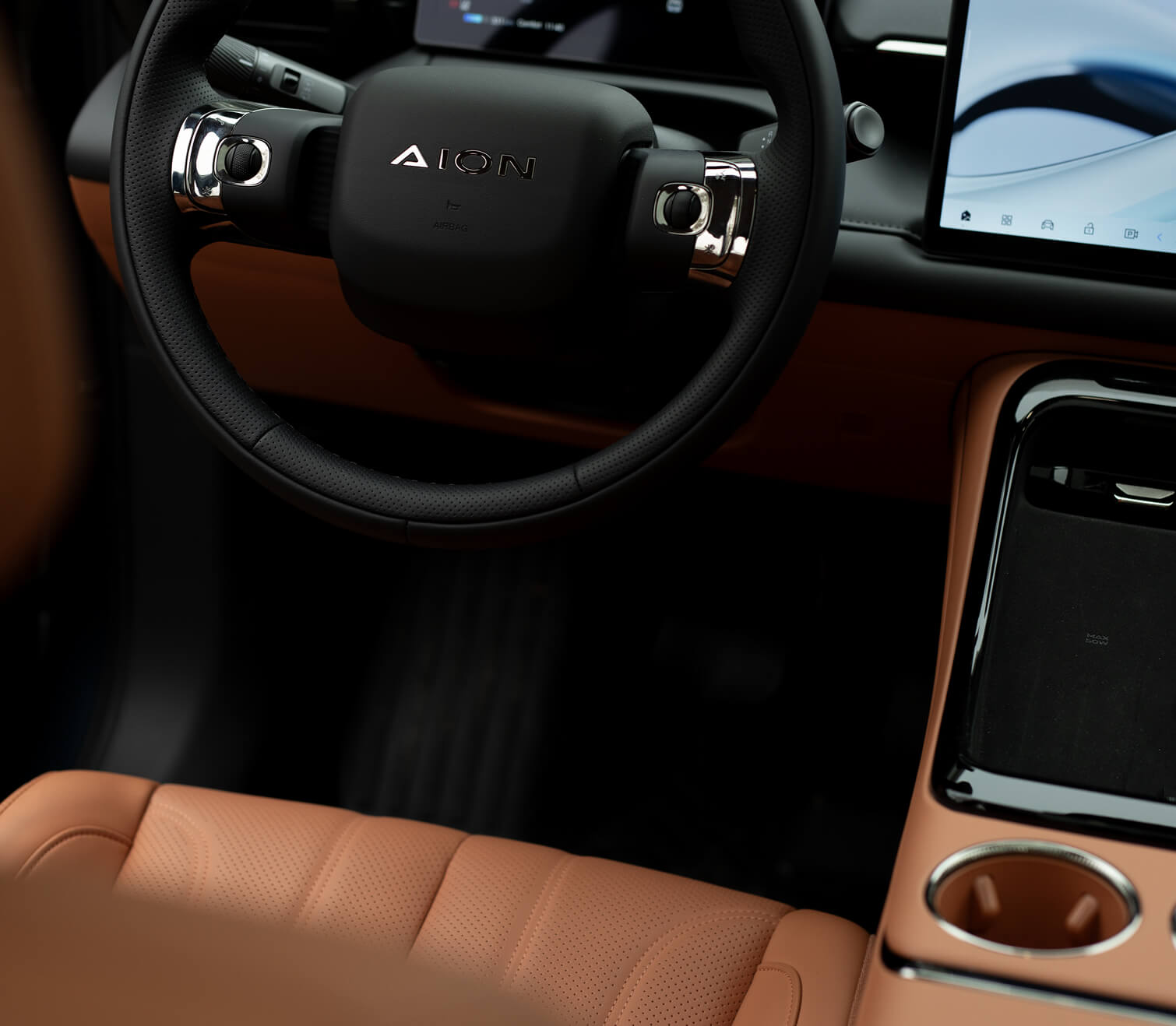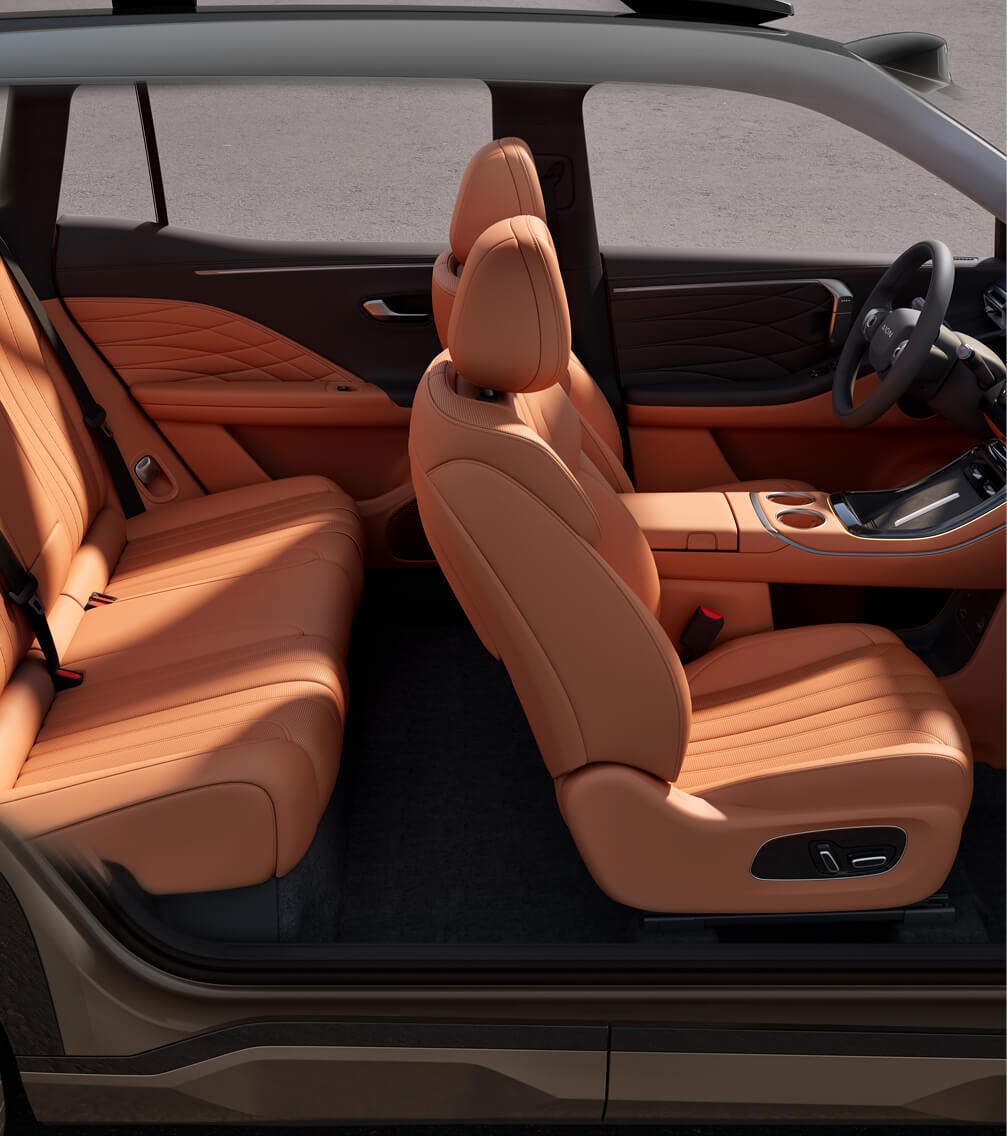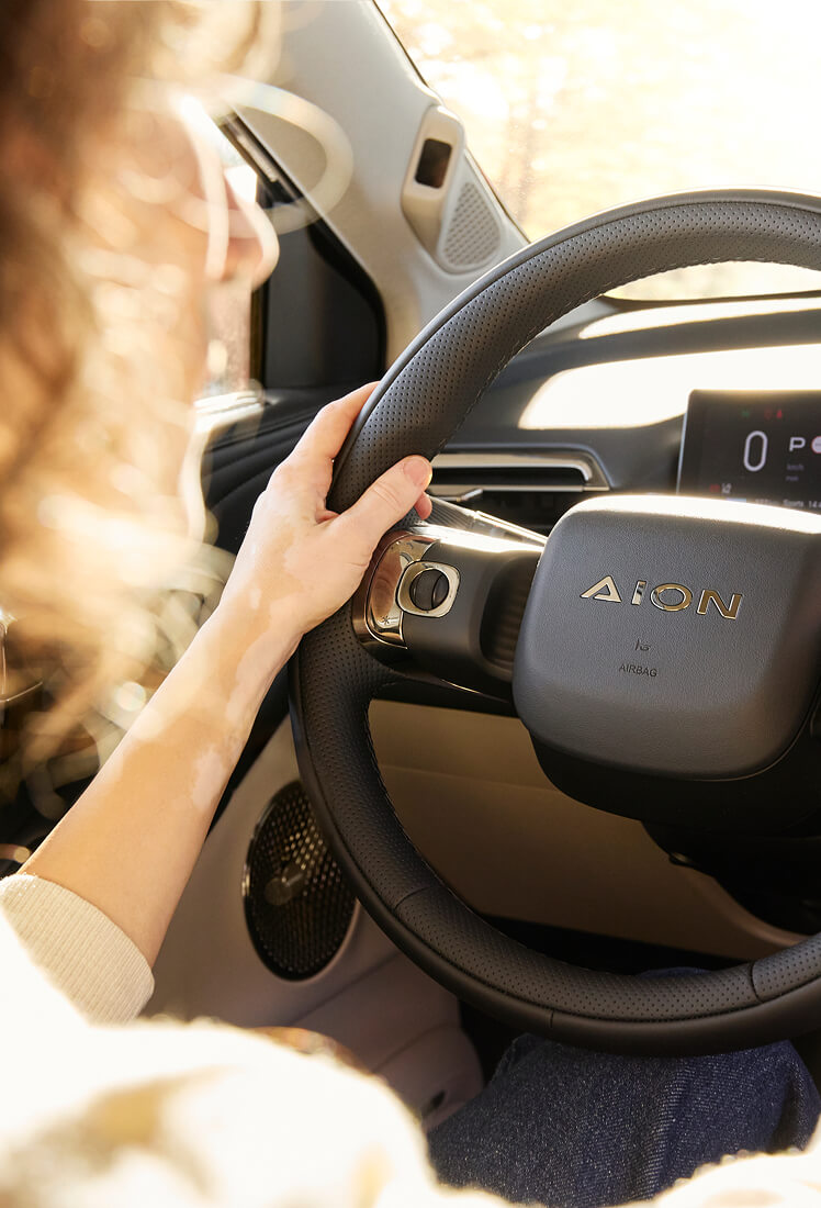 Duża ilość miejsca na nogi oraz płaska podłoga sprawiają, że każda podróż jest komfortowa – zarówno z przodu, jak i na tylnej kanapie. AION V zapewnia swobodę ruchu i naturalną pozycję siedzącą niezależnie od długości trasy.